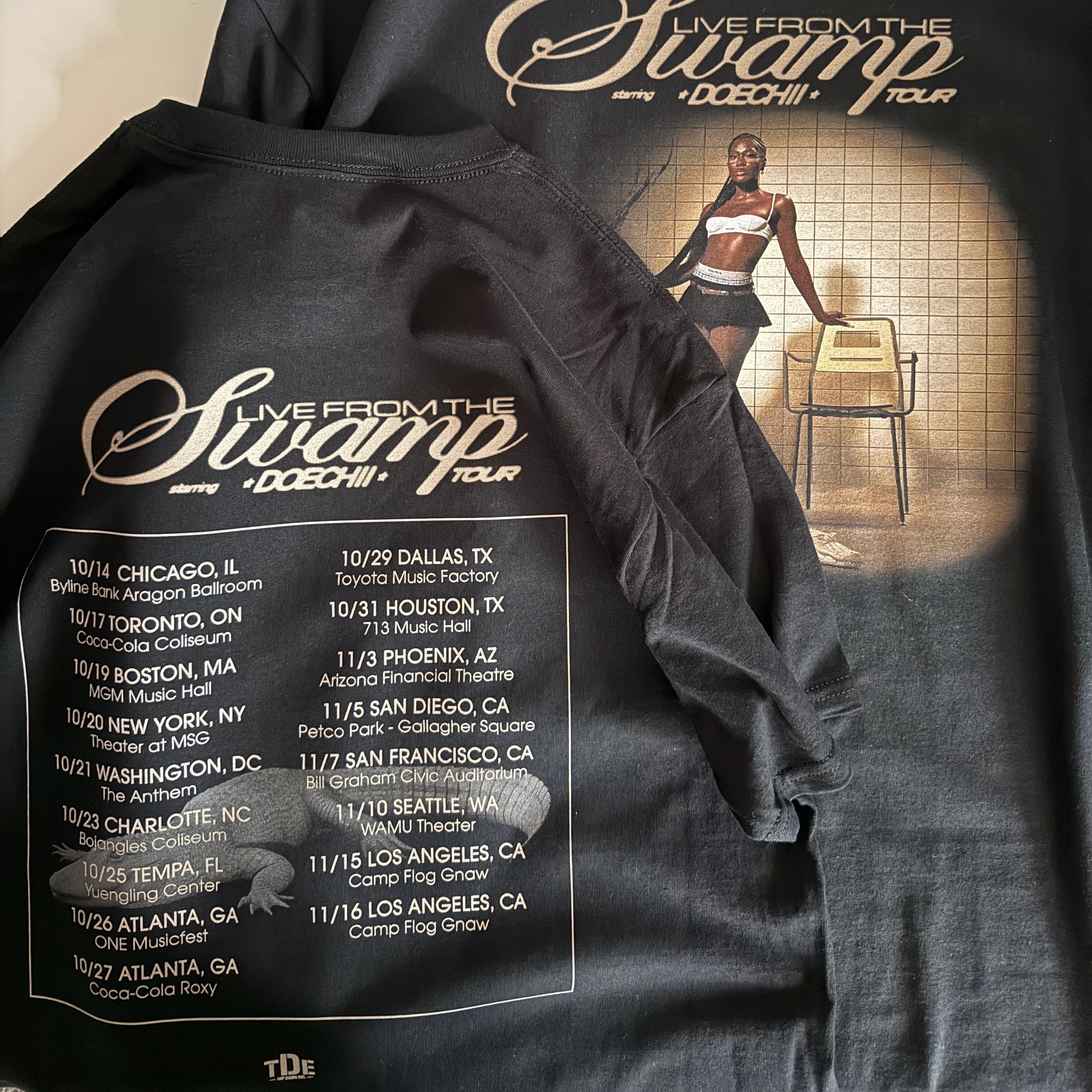 "Yucky Blucky Fruitcake"、"What It Is (Block Boy)"、"Alligator Bites Never Heal" を Kendrick Lamar が絶賛するなど、TDE (Top Dawg Entertainment) 初のフィメールラッパーとしてヒットを飛ばし続ける Doechii (ドーチー) の “LIVE FROM THE SWAMP" ツアー プロモーション 半袖 Tシャツが入荷!