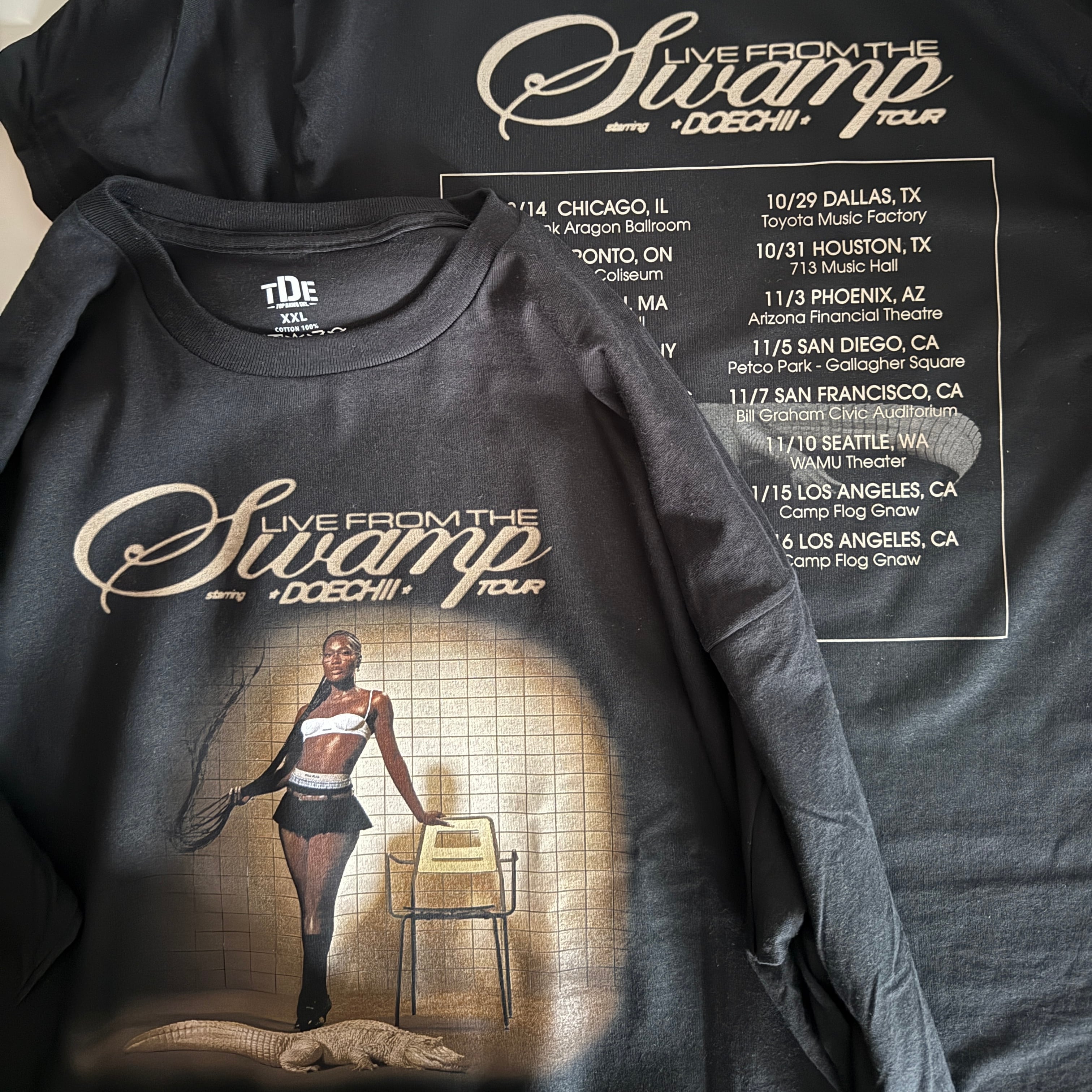 "Yucky Blucky Fruitcake"、"What It Is (Block Boy)"、"Alligator Bites Never Heal" を Kendrick Lamar が絶賛するなど、TDE (Top Dawg Entertainment) 初のフィメールラッパーとしてヒットを飛ばし続ける Doechii (ドーチー) の “LIVE FROM THE SWAMP" ツアー プロモーション 長袖・半袖 Tシャツが入荷!